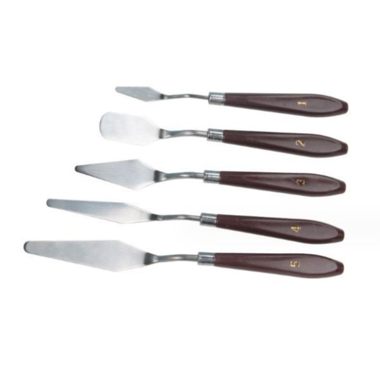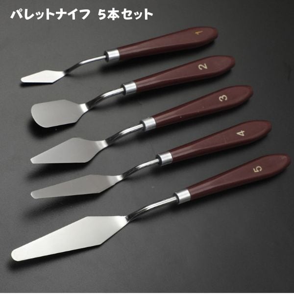 ステンレス製 パレットナイフ 5本セット 新品 スパチュラ ペインティングナイフ 木製 ハンドル 油絵 アクリル塗料 絵画用